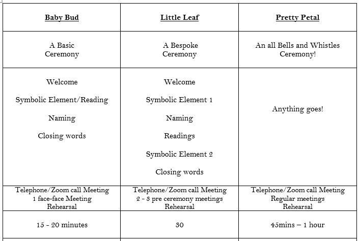 Every ceremony will be unique and each family or couple will have individual requirements for their special day.