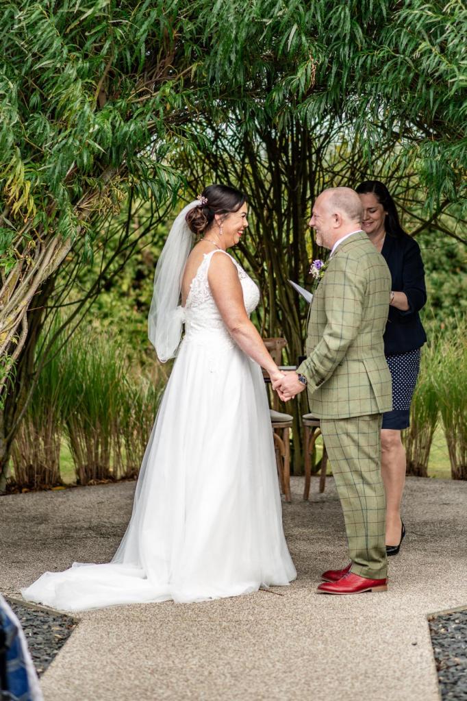 I met Andy and Vicky at Sissons Barn. They were attending an open day for couples who had booked at Sissons Barn. We started chatting about the benefits of a Celebrant Led Ceremony and before I knew it they had booked in! We met a couple of times and planned a ring warming element to personalise their ceremony which was held outdoors in the September sunshine under the Willow.