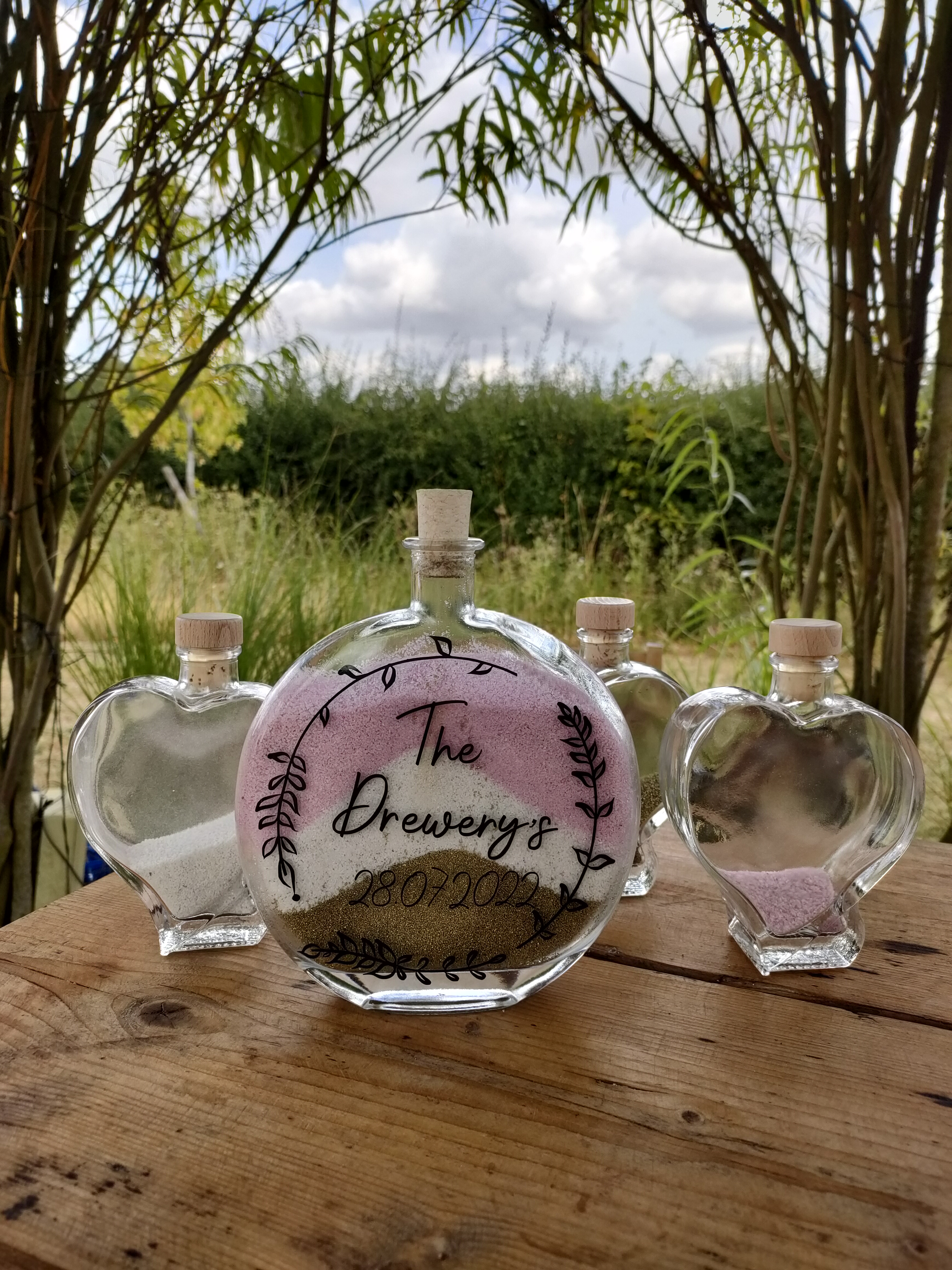 Emma and Jack held their wedding ceremony at Sissons Barn and wanted to include a sand ceremony as part of the service. They have a young daughter and wanted to choose three different coloured sands that matched their theme but also held some meaning for each person. Gold (the colour of wealth), White (the colour of purity) and Pink (the colour of love).