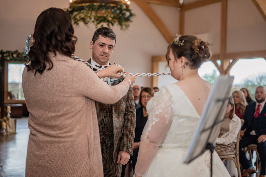 Lauren and James were married at Sissons Barn in Peterborough in February. They opted to include a Handfasting Ritual to represent them ‘tying the knot’. They chose a handfasting cord with three colours and we tied an eternity knot.