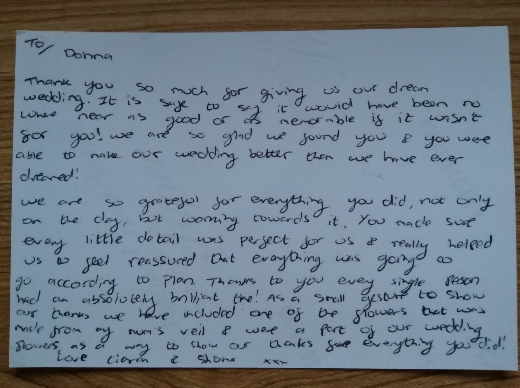 “Hey Donna, just wanted to add to Shona’s review for the parts she wasn’t there for! You helped me feel comfortable and kept me calm during what was a stressful and nerve-wracking moment for me personally. You really helped make the ceremony so special and I can’t thank you enough for what you did. Everyone I spoke with after the ceremony commented on how lovely it was. As you know, I was dreading the ceremony and really just wanted to get to the meal and drinks. But looking back, the ceremony was my favourite part of the night, certainly the part I’ll remember the most! Thank you again for being such an important part of our special day 👰🏼♀️🤵🏻♂️🐕🦺”
