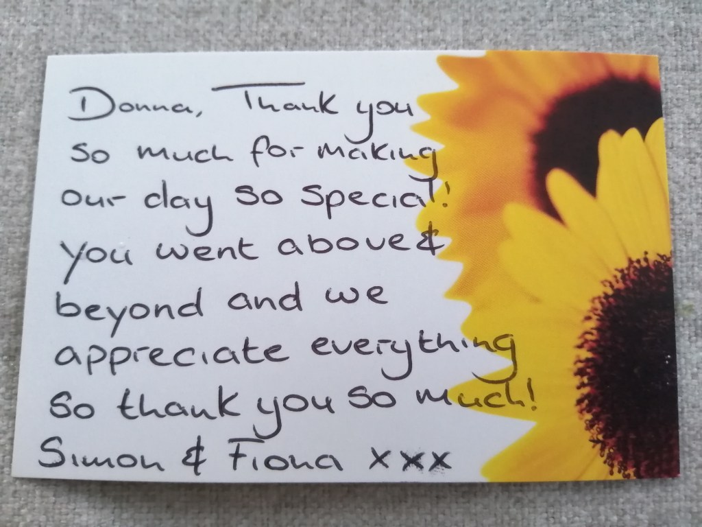 “Donna was amazing!! She took the time to get to know us personally and knew what to write, she was very professional and we knew we could rely on her to make sure everything was perfect. She added little touches like a book presented to us with our ceremony in it. Donna was so friendly and willing to go above and beyond to make the day perfect. We can’t thank her enough for everything she did!”